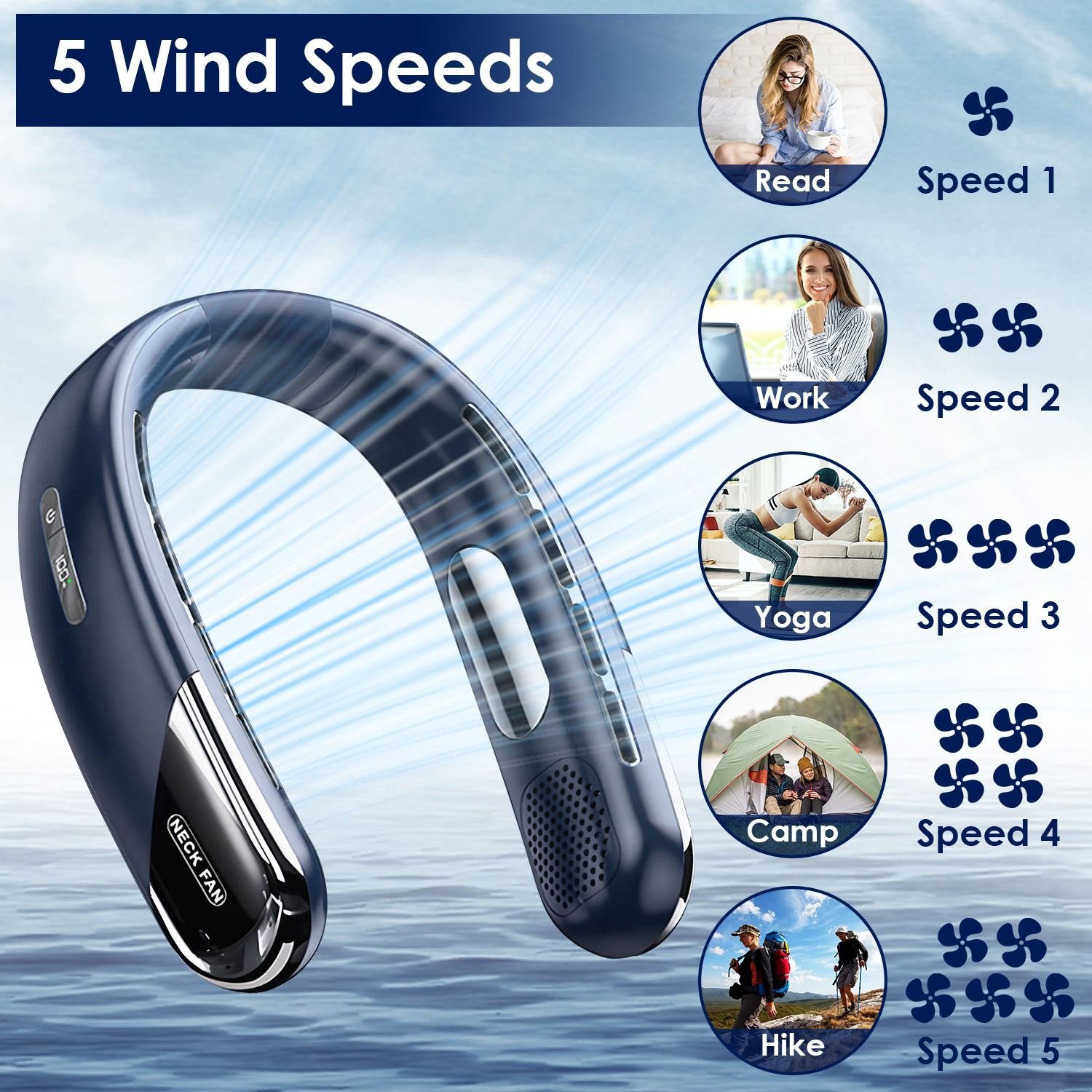*5 Wind Speed Neck Fan*:Designed with 5 adjustable wind speeds and one-key operation,you can effortlessly press the button to adjust speed according to your demands,from soft to strong wind. 360° all-around air flow makes this portable neck fan a perfect working companion in this hot summer.
