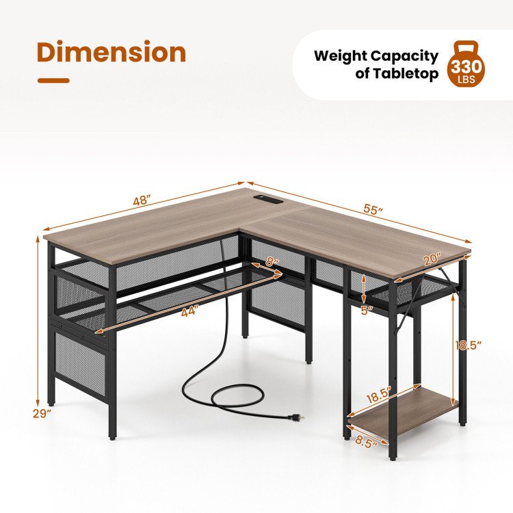 -L-shaped desk with 2-position adjustable shelf for storage convenience