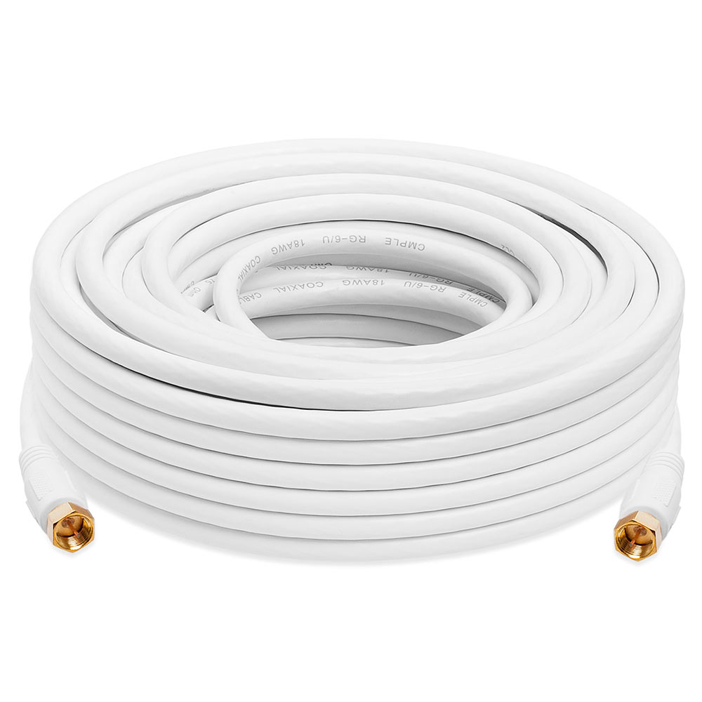 RG6 F-Type Coaxial 18AWG CL2 Rated 75 Ohm Cable - 100 Feet, White These cost-effective high-performance cables give you maximum video quality in a super-thin design. Low-loss 75ohm pure copper wire and foam dielectric ensure optimum picture resolution and color. A foil and braid shield protect against unwanted noise and interference. The molded connectors attach to an ultra-flexible jacket, and allow for easy installation. Heavy-duty connectors ensure long-lasting, high-performance connections. This cable is available in two colors and several length as well. 3 feet, 6 feet, 12 feet, 25 feet, 50 feet, 75 feet, 100 feet Black, White Specifications & Features: 75Ω RG6/U UL Listed High Definition Cables Suitable for DSS, C/Ku Satellite Installations High-Performance 100% Fully Swept to 2200MHz Fully Molded Gold-Plated F Connectors AWG18 Solid Copper/CCS Center Double Aluminum Foil Shield Plus 60-67% Tinned-Copper Braid Shield 0.193inch 5mm nom. OD CPE Dielectric 0.275inch 7mm nom. OD Black PVC Jacket Ultra-flexible PVC jacket for easy installation Corrosion-resistant connectors ensure long-lasting quality Fully molded connectors provide excellent strain relief Color: White Length: 100 Feet Ideal for attaching cable boxes, VCRs, WebTV or any video source with F-type output connections to any TV with matching F-type input jacks