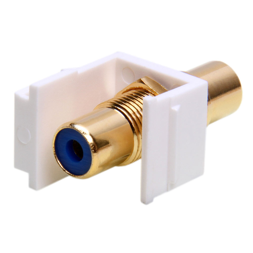 Keystone Jack - Modular RCA White with Blue Center RCA-Style Keystone Jack Coupler Type (female connectors on the front and back) for use with keystone panels or wall plates. These high performance connectors provide a clean connection point for wired electronics to wall outlets allowing cables to be hidden within the walls or cabinetry. They provide for superior signal quality with minimal noise for component or Composite Video and audio systems. It has a molded plastic covering with an RCA port that passes through a signal. This product will install quickly and easily into a wall plate or patch panel and provide a convenient port to access in-wall cable. This Keystone Jack ships in white and blue, but it's available in several other colors of center as well. White, Blue, Green, Yellow, Red Here’s an in-depth look at the specifications of this RCA keystone jack: Ideal for Home Theaters, High Resolution Monitors, and High Fidelity Surround Sound Systems Seamlessly Integrates with All ICC Faceplates Ideal for Residential or Commercial Use Connectors: 1-RCA female on first end, 1-RCA female on second end Color: Blue