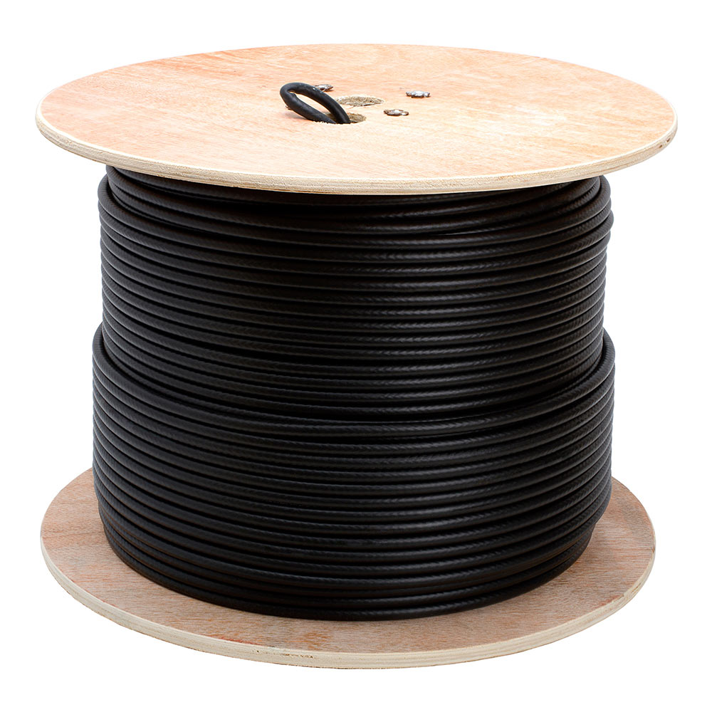 RG6 Quad Shield Wooden Spool - 1000 Feet, Black RG6 Quad Shield Cable is great for Satellite, Cable TV, Antenna installations, Security systems, Surveillance cameras, etc. Built to high standards to ensure reliable performance. Perfect for indoor and outdoor use. Made to work in any weather condition. Running inchFTinch count printed on cable makes measuring easy. HDTV ready. Specifications & Features: Available in both white and black Copper clad steel center conductor 18AWG 60% + 40% Aluminum braid with 100% shield PVC jacket Quad Shielding Fully Sweep - Tested to 3000MHz, 75 Ohm Comes on Wooden Spool Easy installation Sweep-tested to 3 GHz Low-loss for use on long runs Length: 1000 Feet Color: Black
