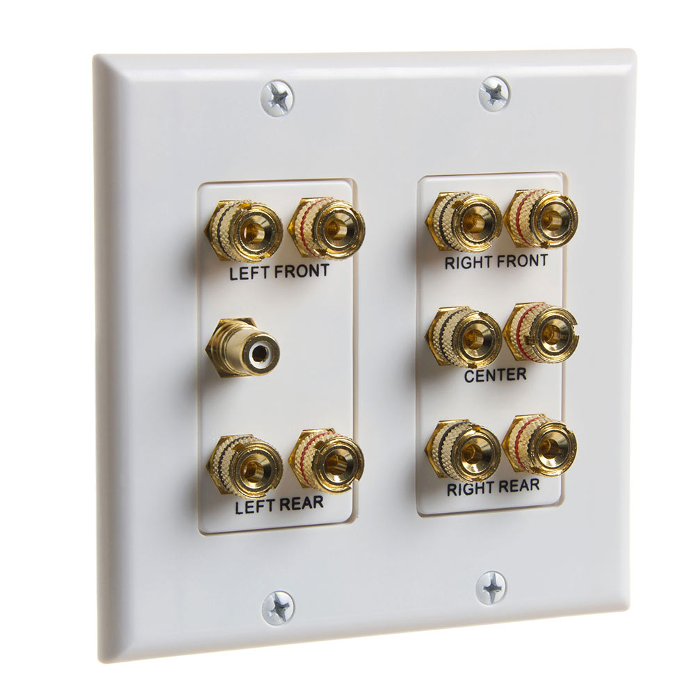 Cmple is a professional grade 2 gang 5.1 surround sound speaker wire wall plate that is pre-configured with integrated gold connectors to support a complete surround sound system installation. This speaker wall plates provide all the flexibility a professional installer or experienced do-it-yourselfer needs to create a sophisticated media environment. Our 5.1 surround sound speaker wall plate features gold plated connectors, clear component location labeling, and (5) pairs of binding posts with (1) RCA jack. No surround sound system installation is complete without a high quality speaker wall plate to help manage your connections! Use this premium speaker wall plate to give your home theater installation a professional finish! Our wallplate are simple to use and allows for all speaker wires to be run within the walls for a clean professional look. The contemporary Decora style features gold plated binding posts for each speaker and offers unique 1-RCA jack for subwoofer. The inserts are labeled for each speaker location and correlate to most home audio receivers. Fits in a standard 2 gang electrical box. Kit includes: Decora wall plate, 2 labeled Decora inserts, 10 gold plated binding posts (5 red/5 black), 1 gold plated RCA jacks and all mounting hardware.