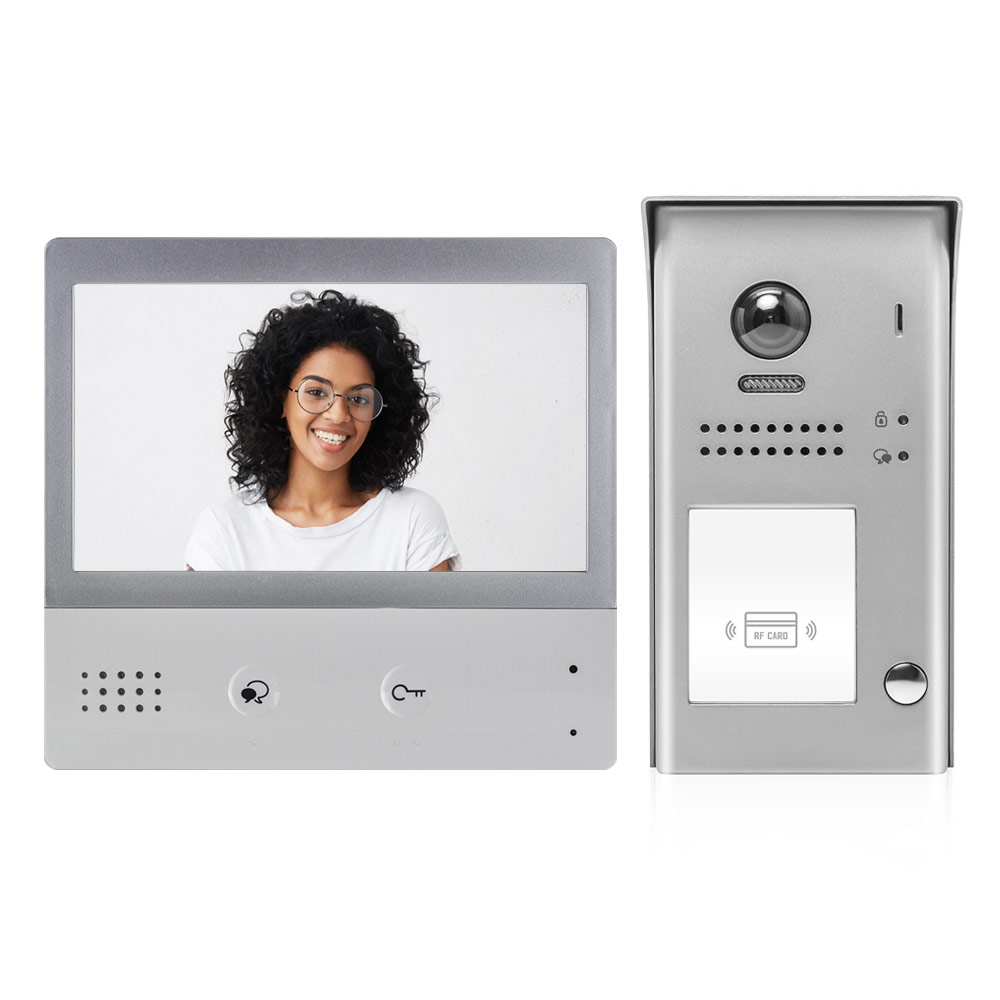 The apartment intercom is an intelligent panel that includes a 7" touchscreen that allows the user to see and speak to people at your door before letting them in. It includes a door relay that can release the electric lock at the door. The person called can answer the intercom using the app on their mobile device. Since the system uses cellphone data, they can control the door from anywhere in the world.