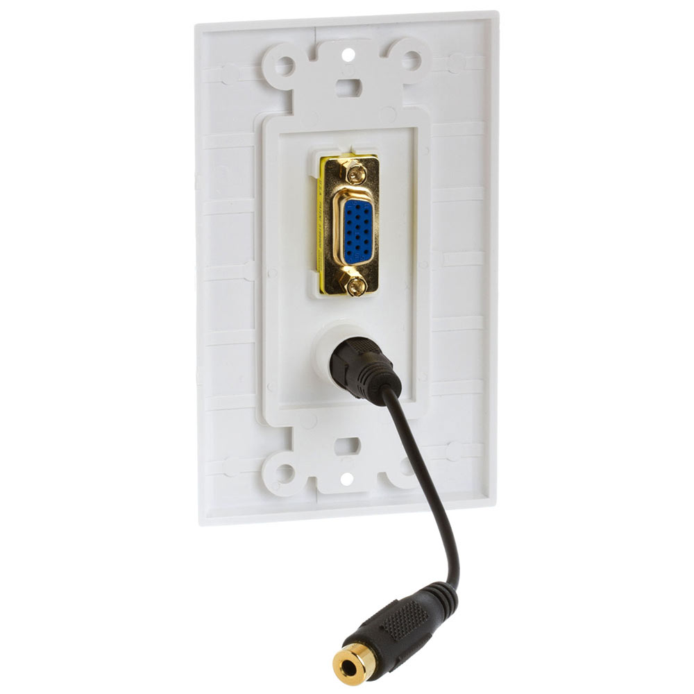 This convenient plate has two female jacks: a standard 15-pin VGA female connector for your video, and a standard stereo audio mini plug jack (1/8 inch/3.5 mm). You just run your video and audio cables through the wall, attach them to the back of the plate, attach your plate to the wall and you’re able to plug and unplug the connections at will. Or leave the computer and television plugged into the wall plate permanently, and have your computer and television connected to each other without ever having to think about it again.