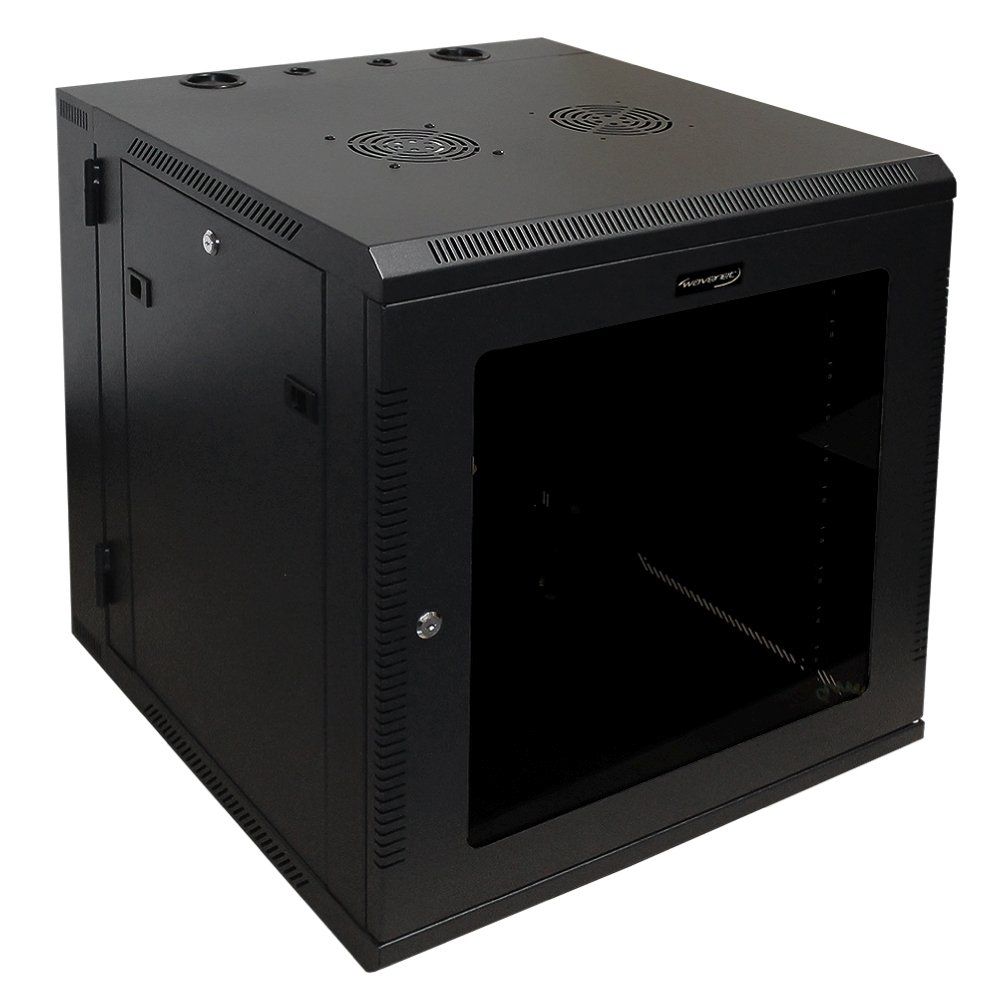 This 12U server rack cabinet lets you mount your EIA-310 compliant equipment to the wall. The enclosure features a mounting depth of up to 24 in. and offers a maximum load capacity of 130 lbs. (59 kg) when properly secured.