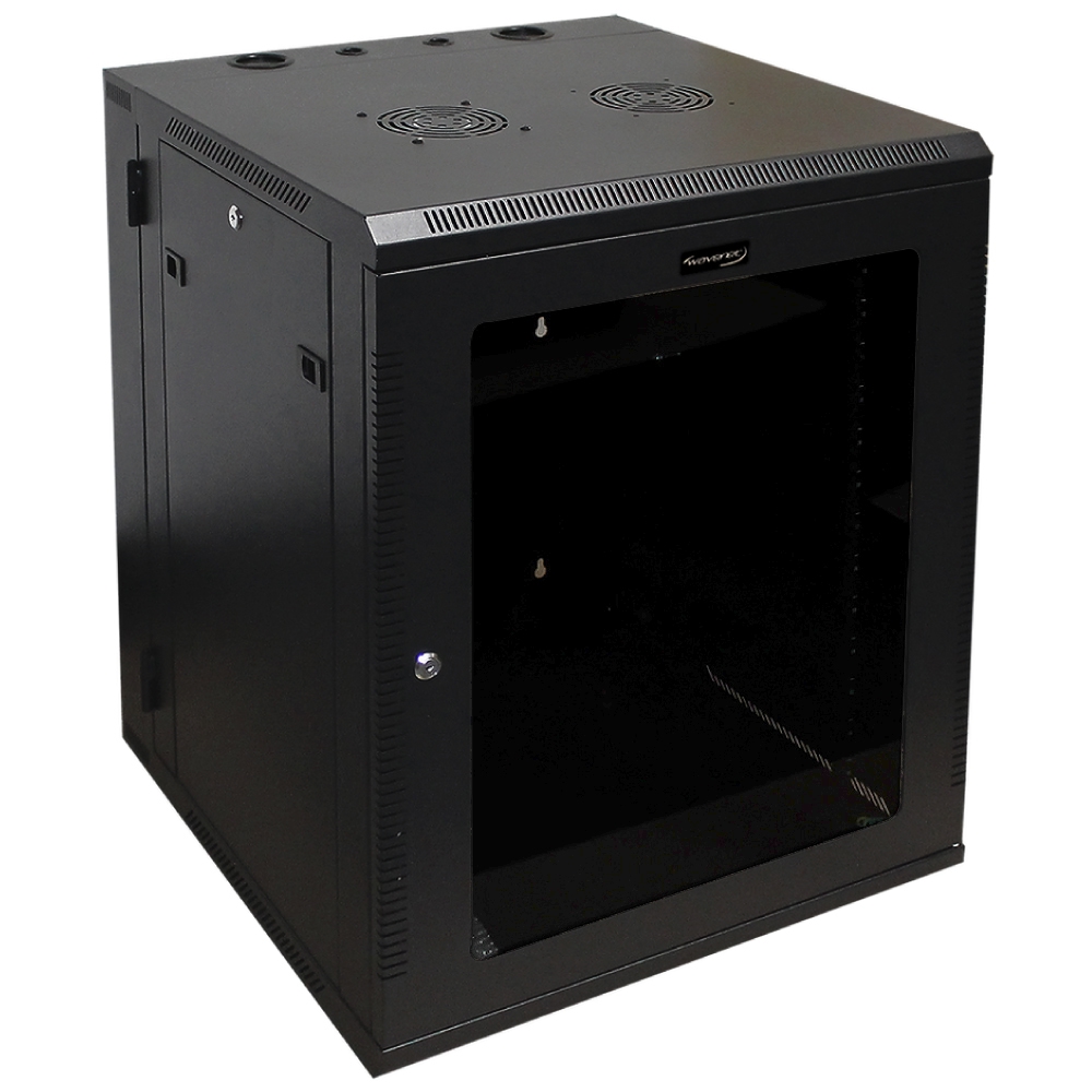 This 15U server rack cabinet lets you mount your EIA-310 compliant equipment to the wall. The enclosure features a mounting depth of up to 24 in. and offers a maximum load capacity of 130 lbs. (59 kg) when properly secured.