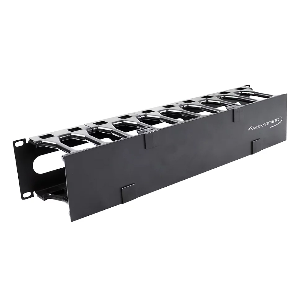 Cable management panel manages efficiently high densities structured cabling in data centers and telecommunication rooms, which allows the maximum amount of cables to be organized in a minimum amount of space. 2U cable management panel can increase the speed of installation or any configuration change and reduce cost for less energy usage.