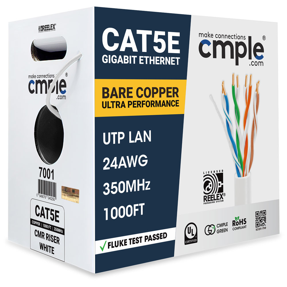1000ft Cat5e Riser Ethernet Cable White | UL, CMR, 24AWG | Bare Copper 1000ft Cat5e Riser Ethernet Cable White | UL, CMR, 24AWG | Bare Copper