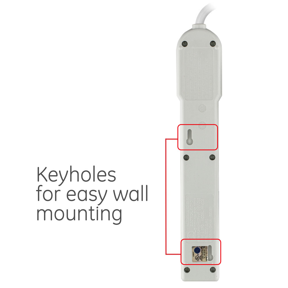 This power strip consists of six 3-hole outlets that houses up to six different electrical devices at a time. A red rocker switch is used to turn electrical current flow on or off, along with a 3-foot long heavy-duty power cord. Two keyholes are present on the underside of the power strip that allows you to easily mount it onto a wall.